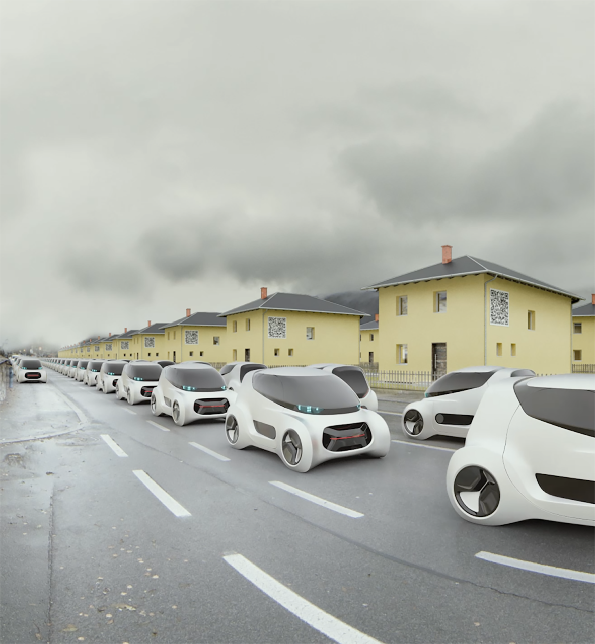 The Year 2045 - The need for new, more cost-effective buildings quickly arose due to the widespread use of planned obsolescence in building structures and materials in previous decades. On the other hand the desire for detached housing structures entered new levels as multiple dwelling solutions were seen as a sign of low-strata-consumer status by clients. The 'solution' for combining these opposing parameters was to create identical single family houses in industrial numbers. Clone-houses were built in their tens of thousands, merely distinguishable by their QR-Facade.