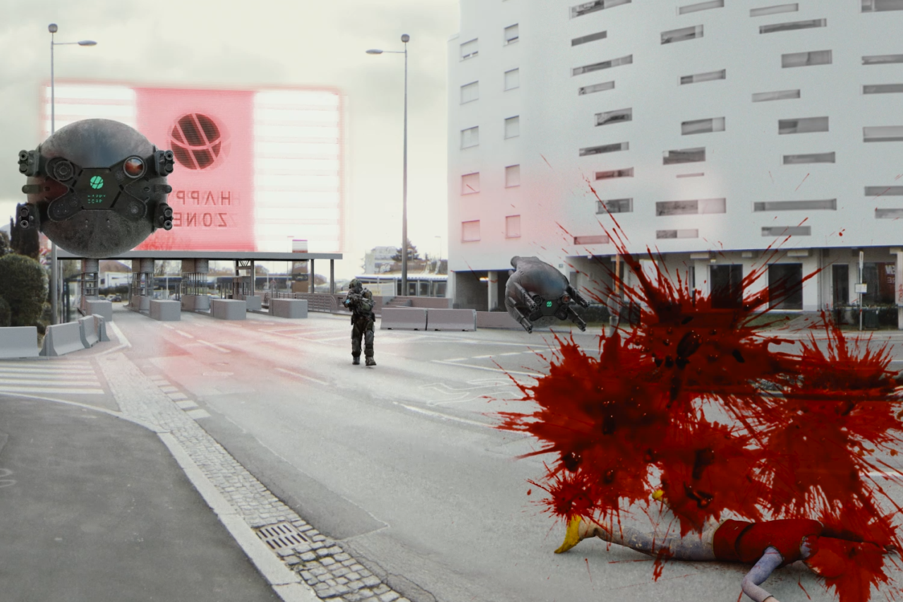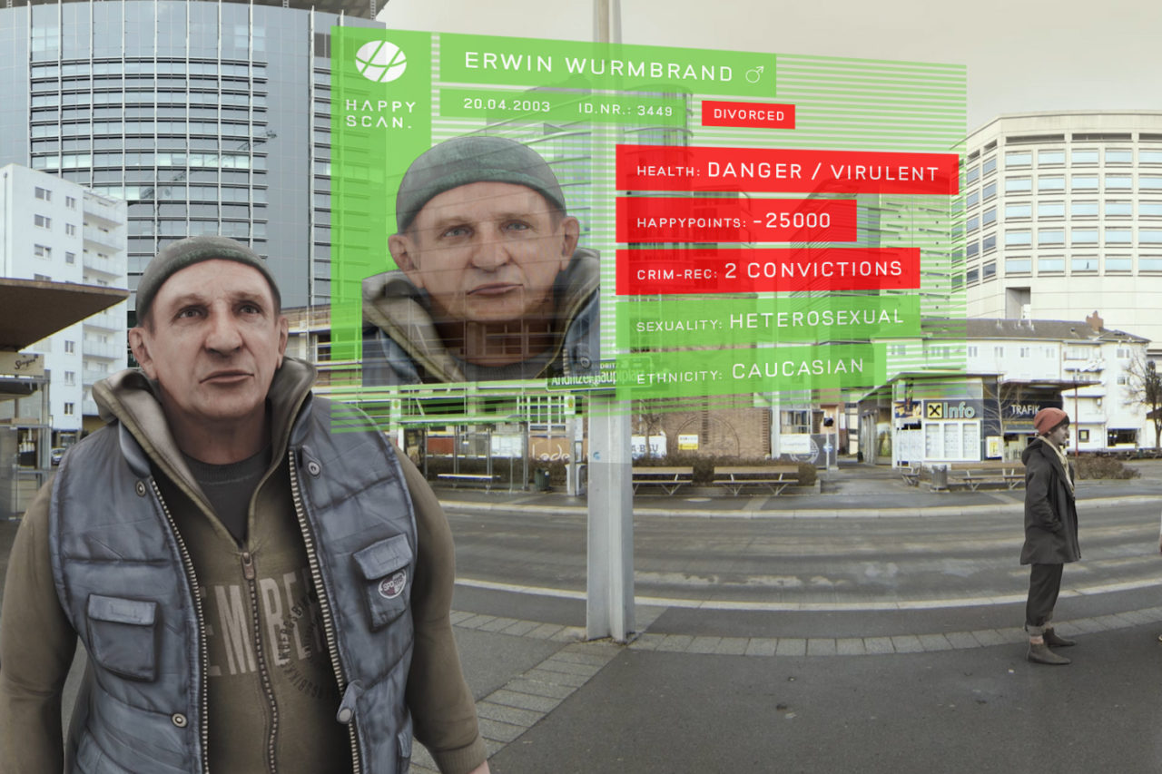 The Year 2101 - Frictions arose frequently on the borders of the happy-zones as low-strata and expels ventured unlawfully into other areas without providing the required happy-point-status. As these intruders were seen as threat to safety happy-security-agents were given extensive liberties in executing and enforcing law and status-calm. In severe cases agents could incapacitate intruders terminally, i.e execute those who could not provide a valid happy-number on their happy-scan.
