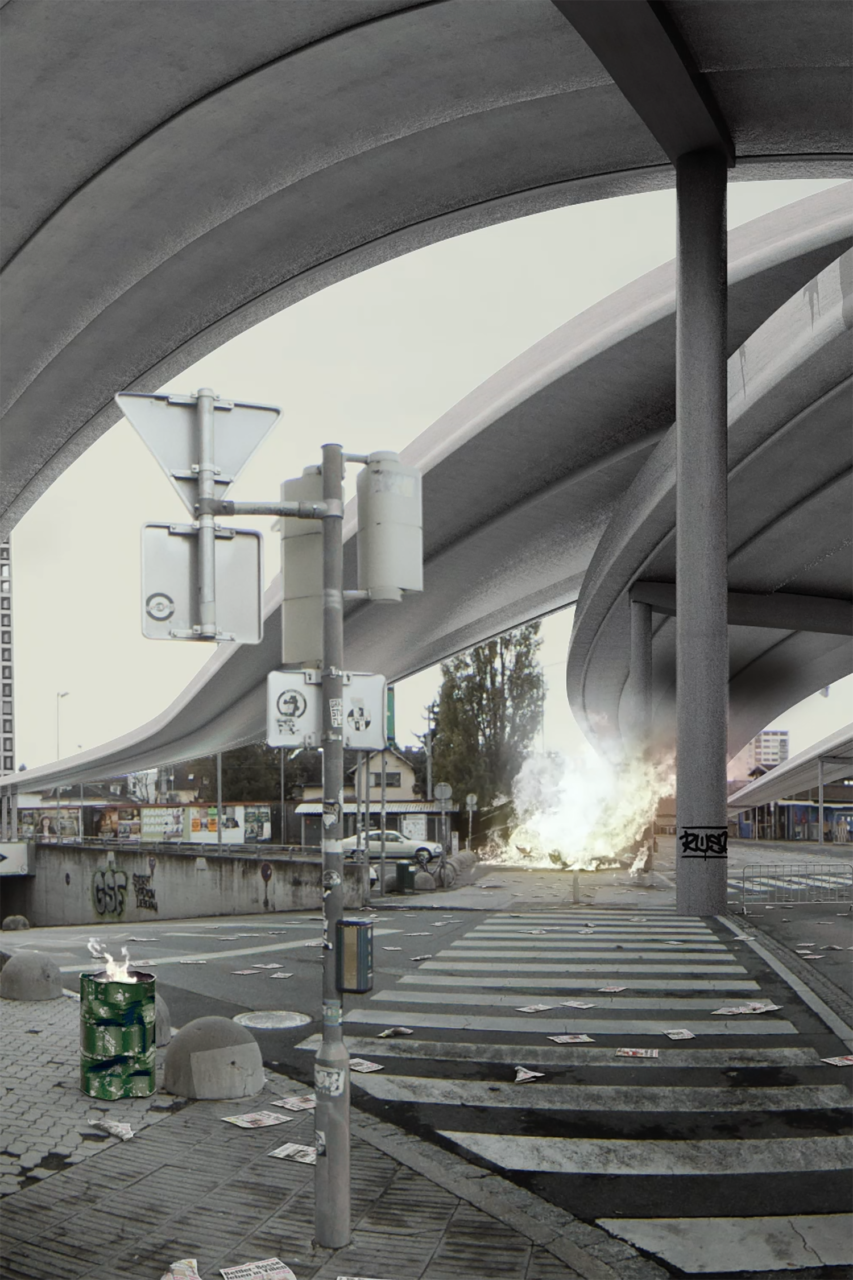 The Year 2057 - Unabated increase of private transport made it necessary to build multilevel road structures to cope with the extensive scope of traffic. These structure were more often than not built on top of the city's old main arteries, which, subsequently turned into habitats of low-strata-consumers and expels. Providing ever rarer shelter from the scorching sun to those not able to afford a 'cocoon' (entry level housing structure, about 4,5 m3), the fly-unders, as those individuals were soon to be known, were prone to data-blocker drug use and other petty crime.